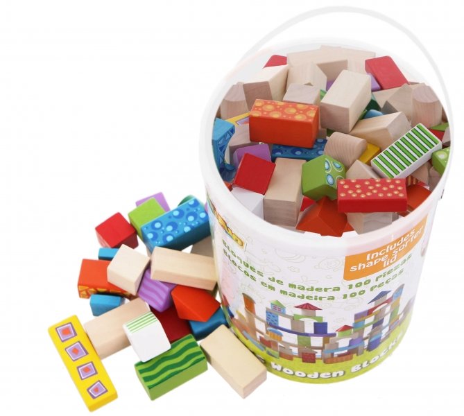 Dětské barevné dřevěné kostky ECO TOYS v kyblíku s ouškem.