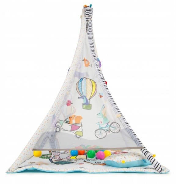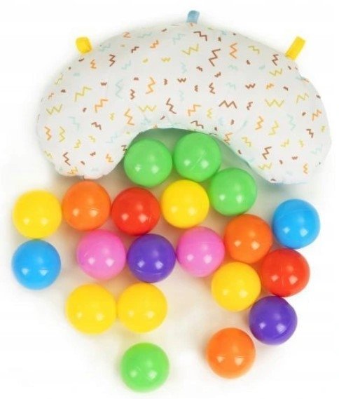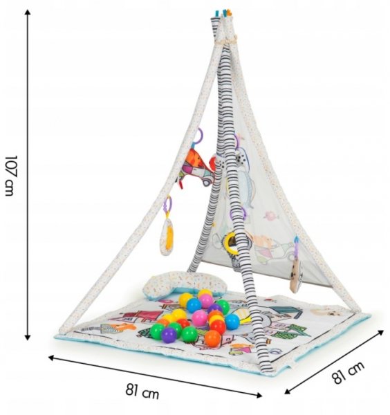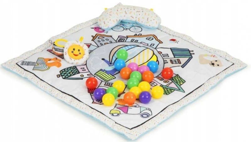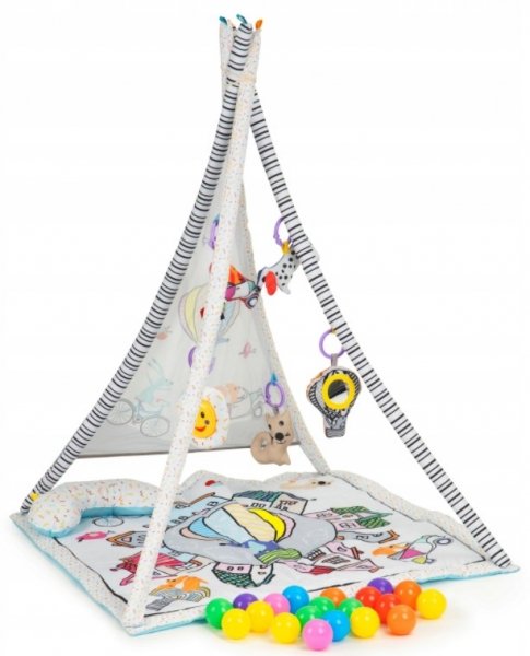 Součástí je 20 barevných míčků, 5 závěsných hraček a pohodlný polštář.