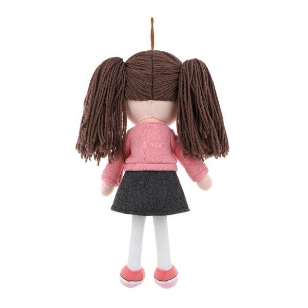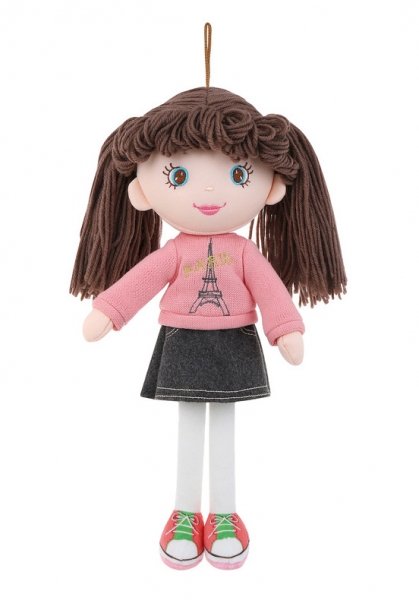 Měkká panenka má na sobě barevné oblečení a barevné vlásky.