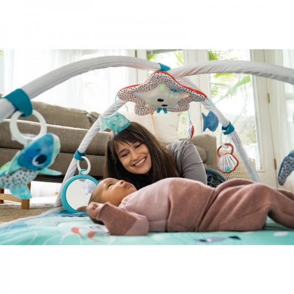 Deka na hraní 2v1 v designu úžasného podmořského světa Upoutá pozornost dítěte již od narození a nabízí různorodé aktivity ke stimulaci všech smyslů děťátka. Deka obsahuje unikátní závěsný kolotoč ve tvaru mořské hvězdice, který zaujme každé děťátko ať už světelnými nebo zvukovými efekty, kde je na výběr až 6 melodií Když děťátko povyroste, kolotoč se odepne a najednou se změní na interaktivní hračku plnou zábavy, která reaguje na jemné dětské údery.