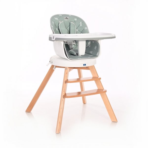 Posuvný stůl s omezovačem třísla ve 2 polohách je vybaven odnímatelným podnosem s vybráním pro láhev či hrnek. Pohodlné sedadlo s PU prodyšným potahem z ekologické kůže se snadno čistí, aniž by ztratilo svůj původní vzhled. Balení obsahuje dlouhé a krátké nohy z přírodního dřeva s protiskluzovými podložkami vespod. K dispozici jsou 2 stupačky pro batole a starší dítě.