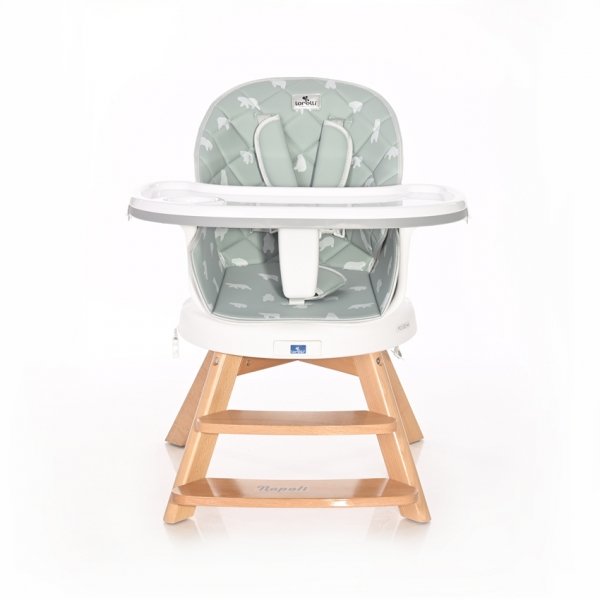 Jídelní židle Lorelli NAPOLI 'roste' s dítětem. Sedadlo se otáčí o 360 stupňů se sedmi polohami zámku. Konstrukční řešení umožňuje, aby byl tento model použit jako dvouúrovňová vysoká židle, odnímatelné sedadlo s instalací na standardní židli a jako stolička.