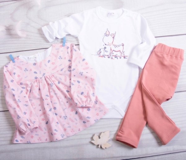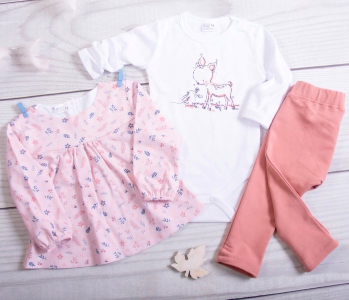 K-Baby 3-dílná sada, 1x body dl. rukáv, tunika, legíny - Bambi, růžová, koral - 62 (2-3m)