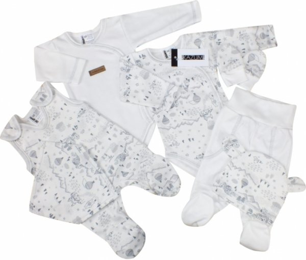 Sada obsahuje:bílé body dl. rukáv zapínání bokem + body dl. rukáv zapínání bokem s potiskem + bílé polodupačky + dupačky s potiskem + čepička + rukavičky + šátek.
