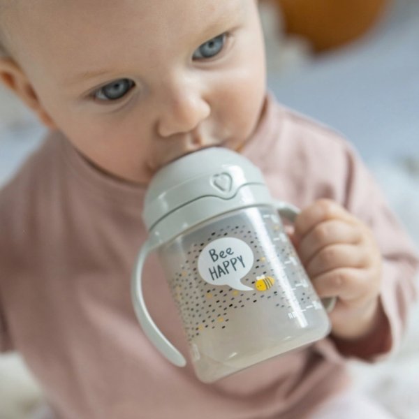- náustek je ohnutý jako lžička, když nepije dítě z láhve, doporučuje se dávat vodu z lžičky, takže hrneček je skvělý způsob, jak se začít učit pít.