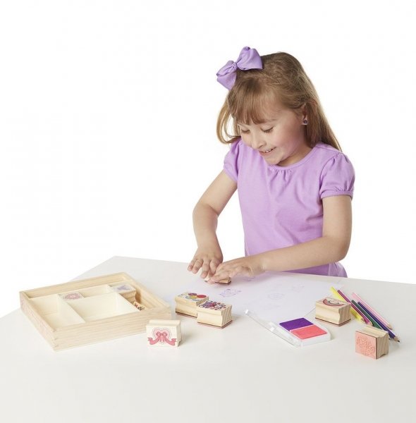 Paleta 9 razítek se srdíčky, duhou, medvídkem, kětinkami, balónky i srdíčkem, 2 polštářky barvy oranžové a modré, 5 barevných pastelek v dřevěném pouzdře.
