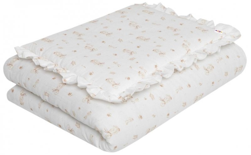 Sada povlečení vyrobená z nejkvalitnějšího bavlněného mušelínu double look. Skládá se z polštáře 40x50cm zdobeného ozdobným volánkem a přikrývky 120x90cm.