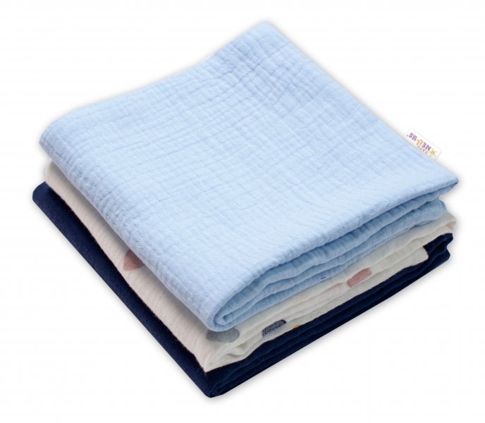 Sada obsahuje 3 kusy plen. Mušelín je lehký, savý a prodyšný materiál, který je šetrný k jemné pokožce vašeho miminka. Tento materiál se nemusí žehlit, což znamená velkou pomoc a ušetření času pro nás maminky. Po vyprání je materiál krásně naducaný a strukturovaný.