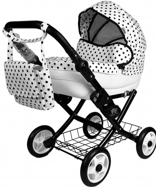 NESTOR Dětský kočárek pro panenky Viki - bílý, černé puntíky