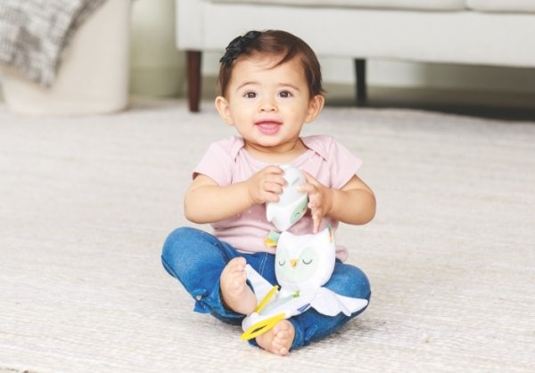 Unikátní muchláček v podobě sovy je vyrobený z materiálu, který ve tmě jemně svítí. Je tak ideální jako hračka do postýlky pro uklidnění vašeho dítěte v noci. Součástí hračky jsou i tři kousátka z jemného silikonu, která pomáhají dítěti při prořezávání prvních zoubků. Šusticí křídla a různorodé textury hračky budou lákat dítě ke zkoumání. Rozměry muchláčka 20 x 25 cm.