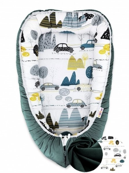 Oboustranné hnízdečko Baby Nellys Velvet, 55x75cm - Auta v aleji - velvet zelené