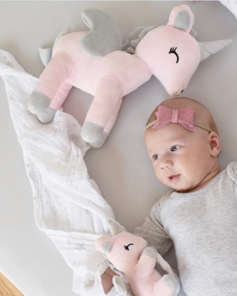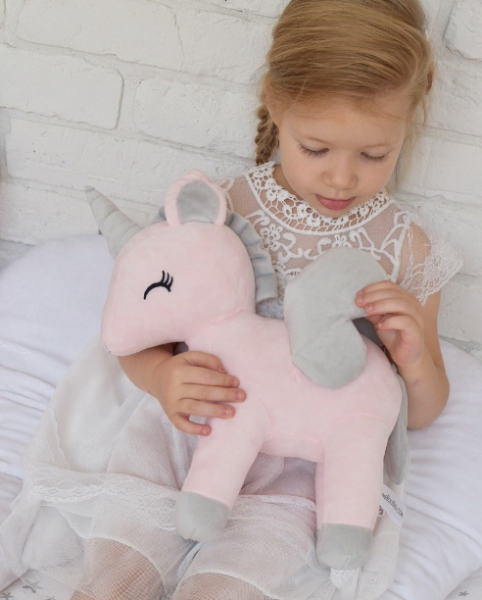 Měkký a plyšový materiál, křídla a nos ve tvaru srdce a "usmívající se" oči jsou zvláštnosti tohoto jednorožce.