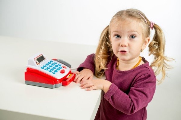 Dětská elektronická pokladna s doplňky pro každý správný obchod. Funkční kalkulačka s displejem, otevírací zásuvkou s penězi a světlem a zvukem u čtečky čárových kódů.
