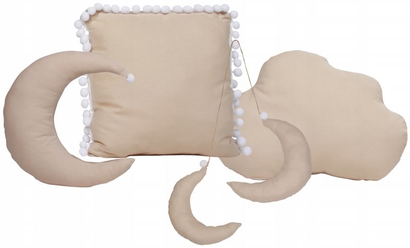 3. 5 roztomilých plyšových polštářků - 3 měsíčky, obláček, čtverec zdobený bambulkami. Výplň tvoří měkké antialergické silikonové kuličky.