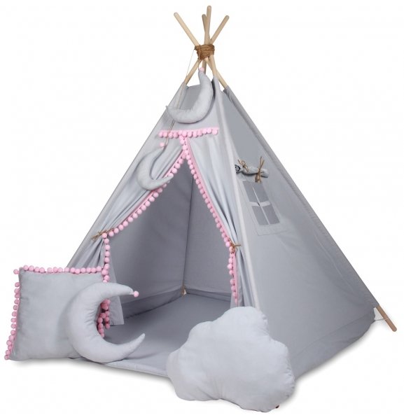 Stan pro děti týpí Baby Nellys + výbava - šedý s růžovými bambulkami