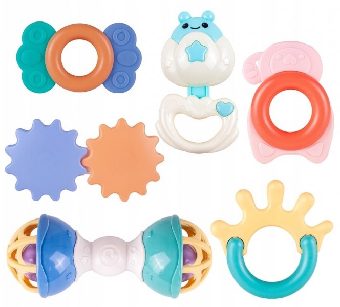 Tato sada 6 roztomilých chrastítek v různých tvarech je perfektní hračkou pro každé miminko. Jeho design z něj dělá perfektní chrastítko pro rozvoj hmatových, citových a uchopovacích dovedností. Měkké části chrastítka lze použít jako kousátka.