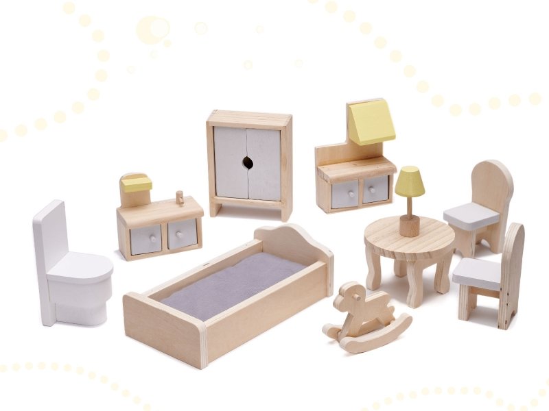 Moderní velký 70 cm dřevěný dětský nábytek pro panenky. Domeček má 3 patra a 5 samostatných pokojů kuchyň, obývací pokoj, koupelna, schodiště a ložnice. Součástí je i nábytek - dřevěná postel, dřevěný stůl, dvě křesla, velká skříň s otevíracími dveřmi, záchod, umyvadlo, dřevěná lampa, sporák s digestoří a houpací kůň. Společná zábava začne už při sestavení domečku, spolupráci děti i rodičů. Kvalitní a precizní zpracování zaujme svými detaily. Miniatury nábytku a grafika na stěnách dělají z dům jedinečný.