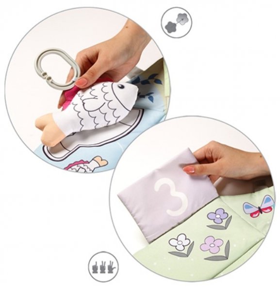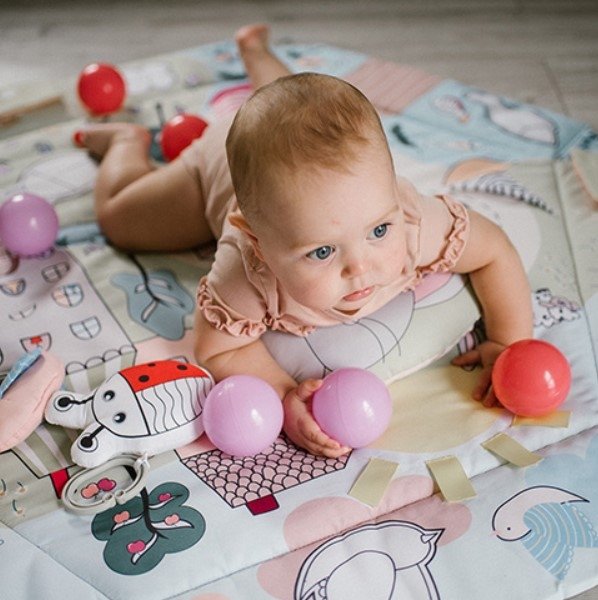 Naše podložka není jen místem na hraní, ale také prostorem pro učení. Podložka obsahuje šustící a vrzající prvky, knihu, vyčnívající visačky, závěsné hračky a skládací knihu. Vaše ratolest díky tomu rozvíjí motoriku, stimuluje zrak, sluch a hmat a procvičuje kognitivní dovednosti. Naši vzdělávací podložku jsme navrhli tak, aby rostla s vaším dítětem. Stačí zvednout strany podložky a ta se promění v suchý bazén, do kterého můžete házet barevné míčky, které jsou součástí sady. Až vaše ratolest vyroste, z podložky se stane hrací kobereček.