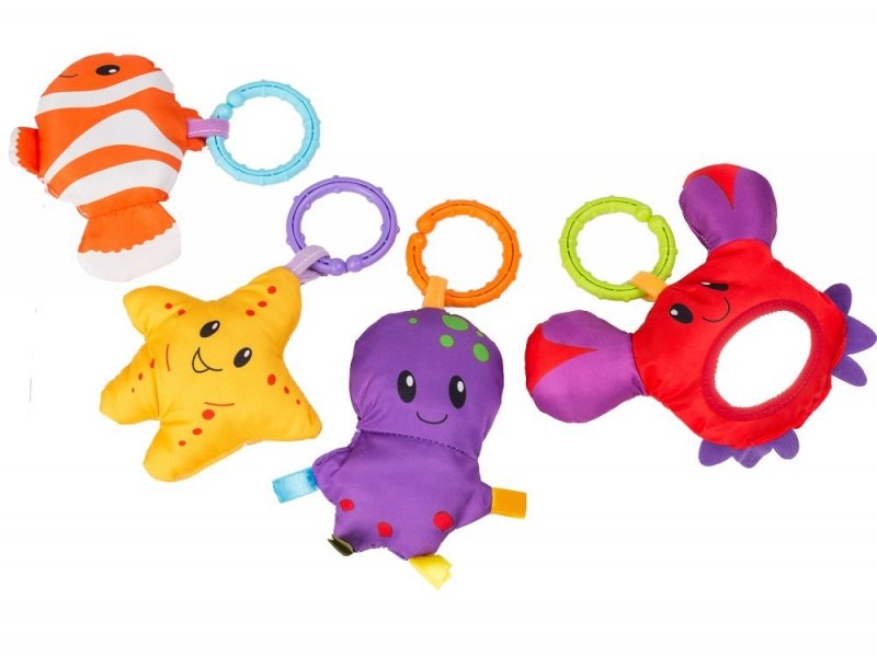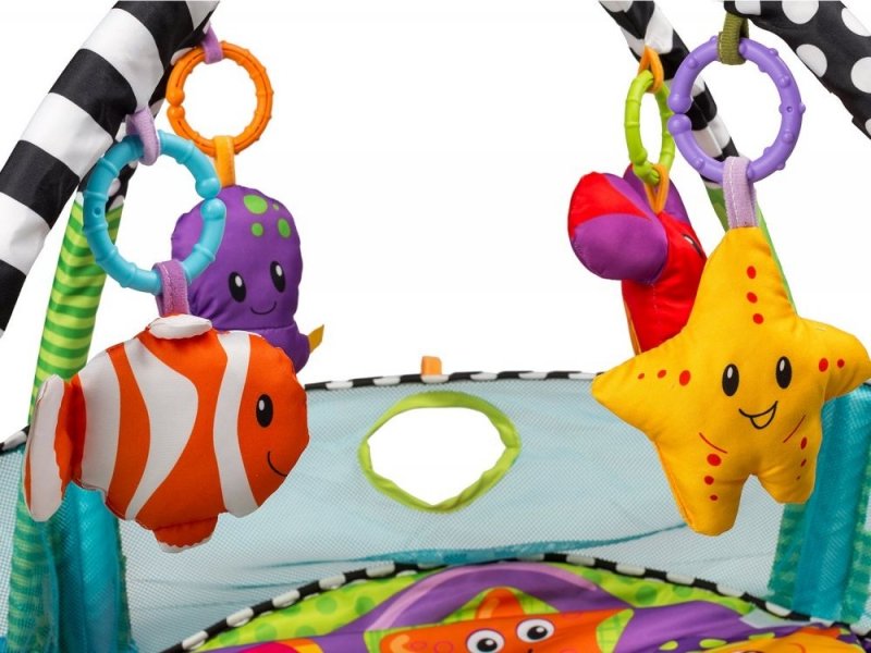 Barevný oblouk má 4 závěsné hračky - rybička Nemo, krab s bezpečným zrcátkem, hvězdice, chobotnička.