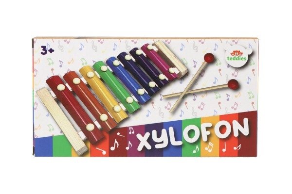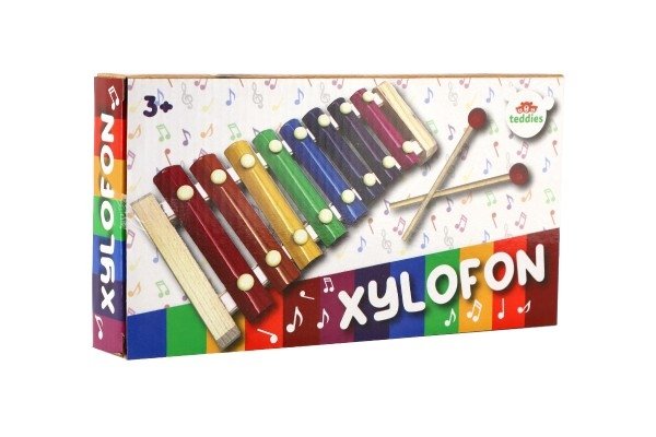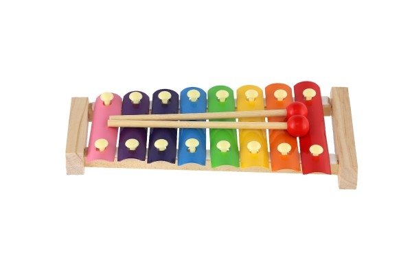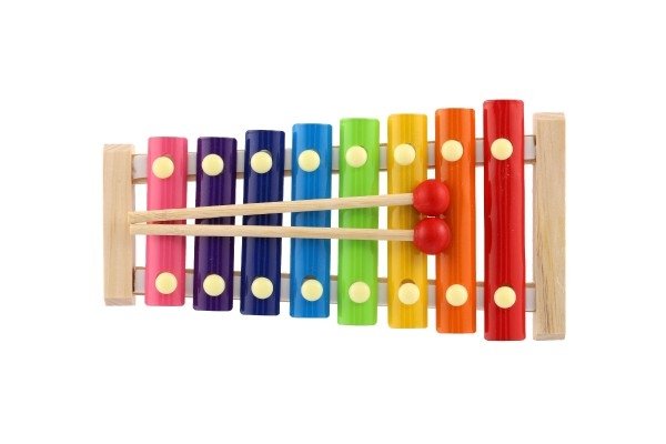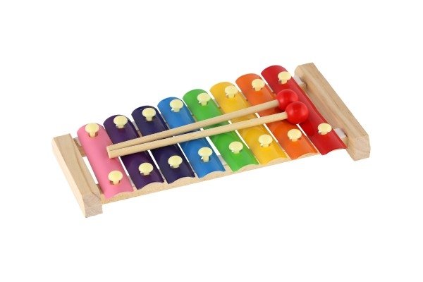 Krásně barevný dětský xylofon vyroben z kombinace dřeva a kovových různě velikých desek, díky kterým se dítě učí jednotlivé tóny a učí se hrát jednoduché melodie skladeb pomocí dvou hůlek. Hračka rozvíjí smysly pro možnost hudební tvorby a pro rytmus.