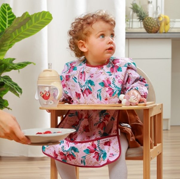Zástěra s rukávy je voděodolná a snadno se čistí, takže se vám bude hodit při učení samostatného stravování. Zapínání na suchý zip.