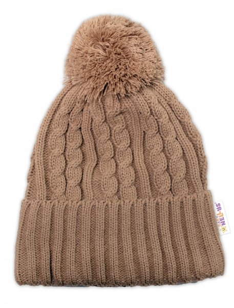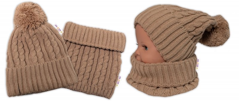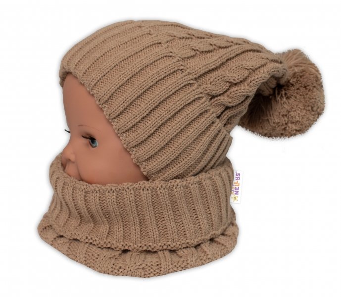 Zimní čepice s bambulí + komínek Baby Nellys - béžová, vel. 48-52cm - 98-104 (2-4r)
