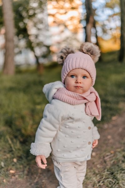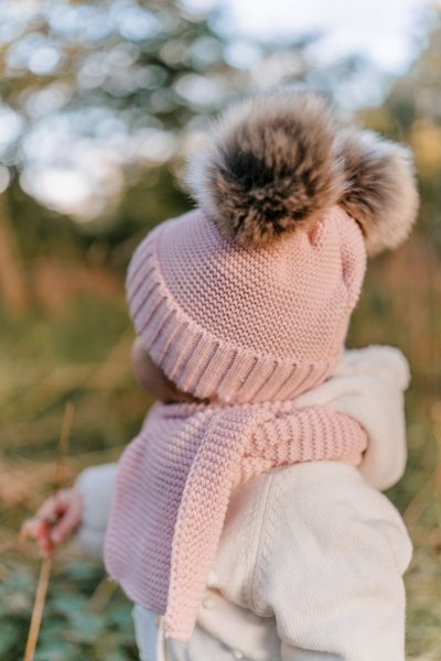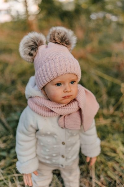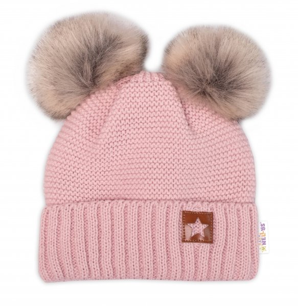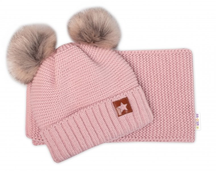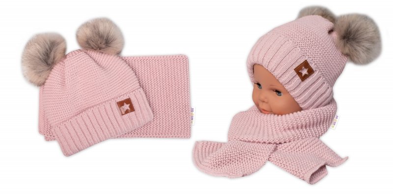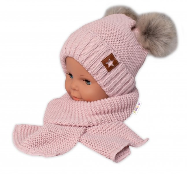 Zimní čepice s kožešinovými bambulemi + šál Baby Nellys Star - pudrová, vel. 38-40 cm - 56-68 (0-6 m)