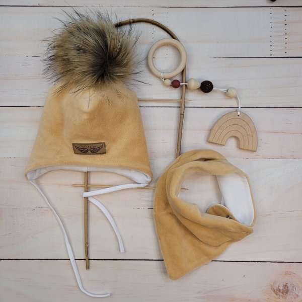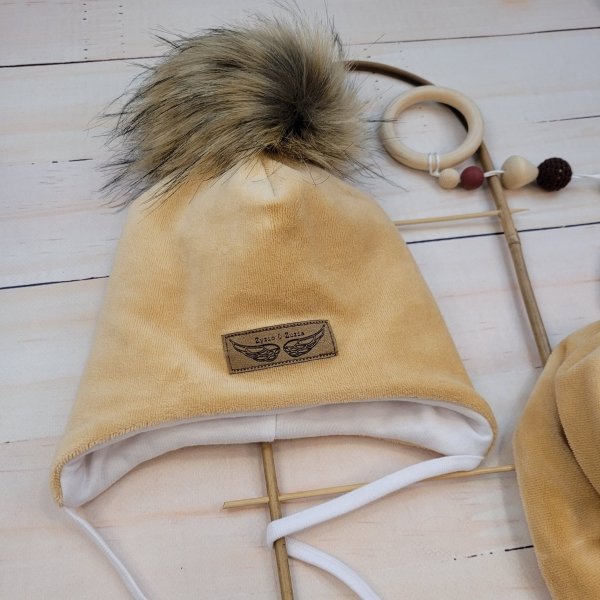 Zimní dvouvrstvá čepice na zavazování s bambulí z kožešinky + šátek Z&Z