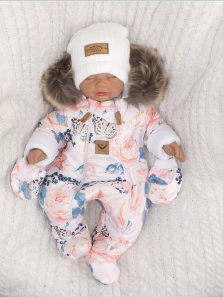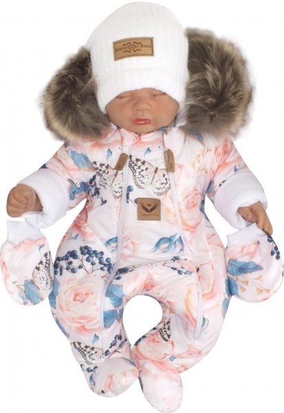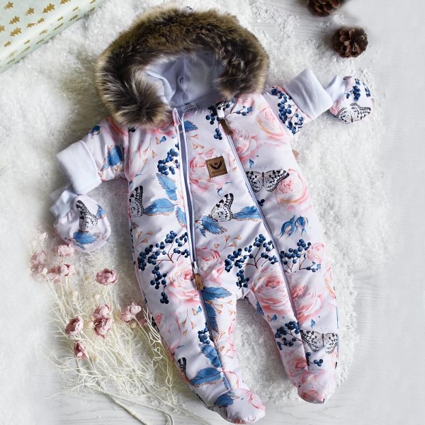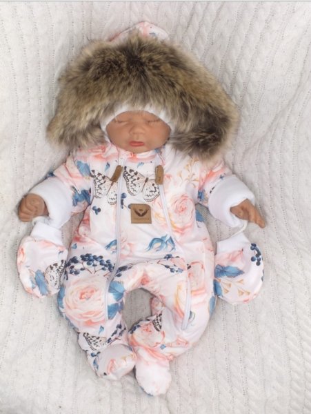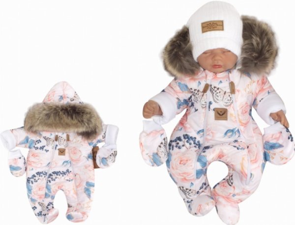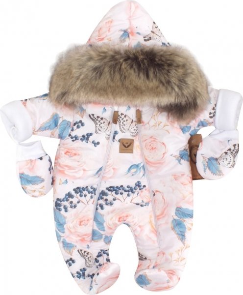 Zimní kombinéza s dvojitým zipem, kapucí a kožešinou + rukavičky