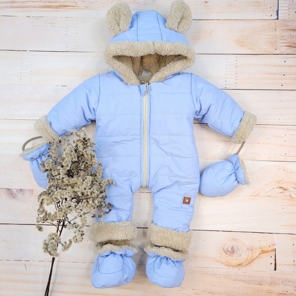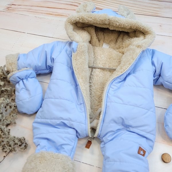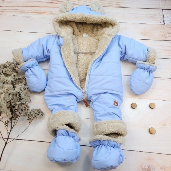 Zimní kombinéza s ozdobným béžovým medvídkem.