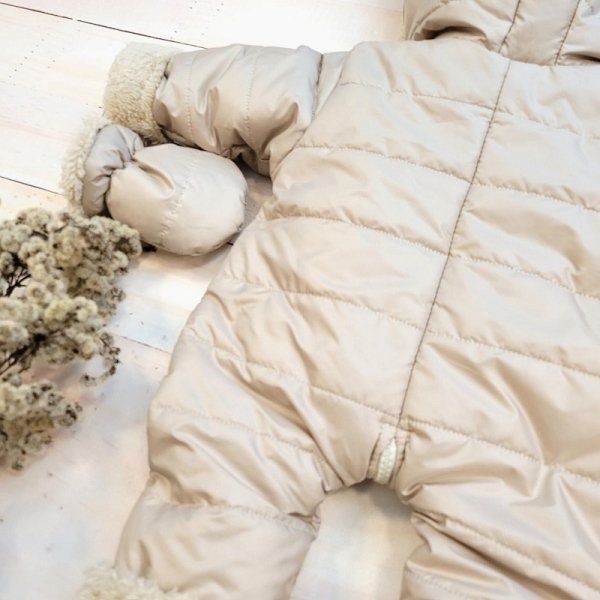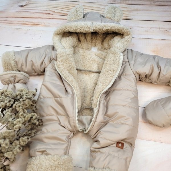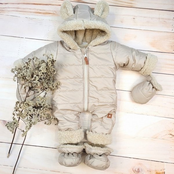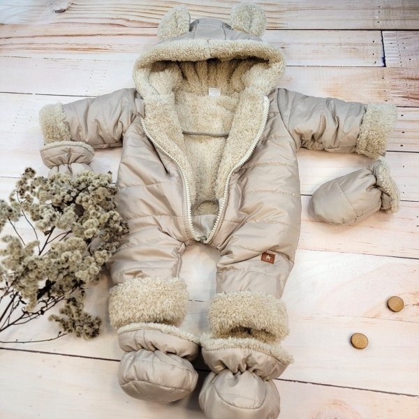 Zimní kombinéza s ozdobným béžovým medvídkem.