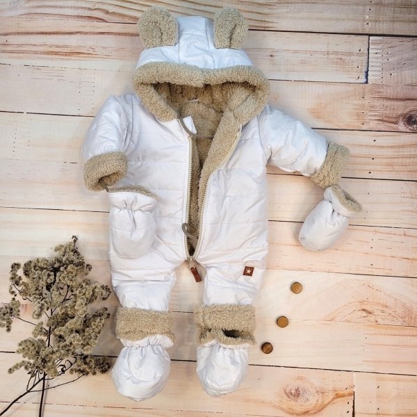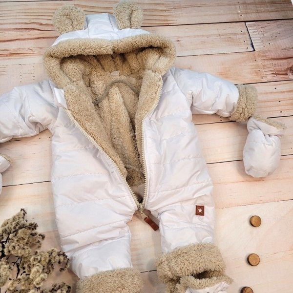 Zimní kombinéza s ozdobným béžovým medvídkem.