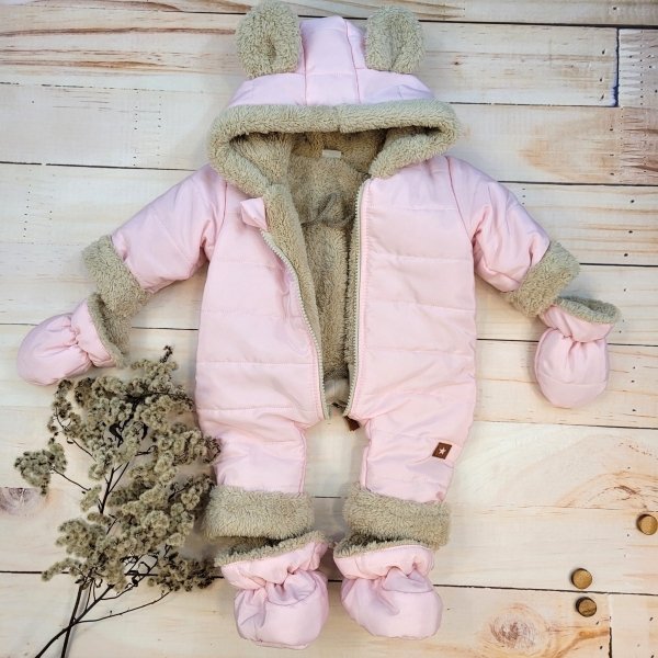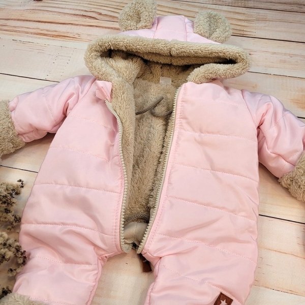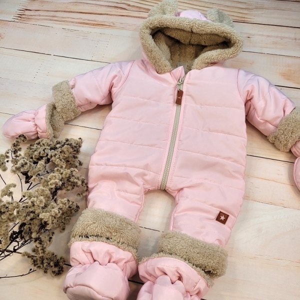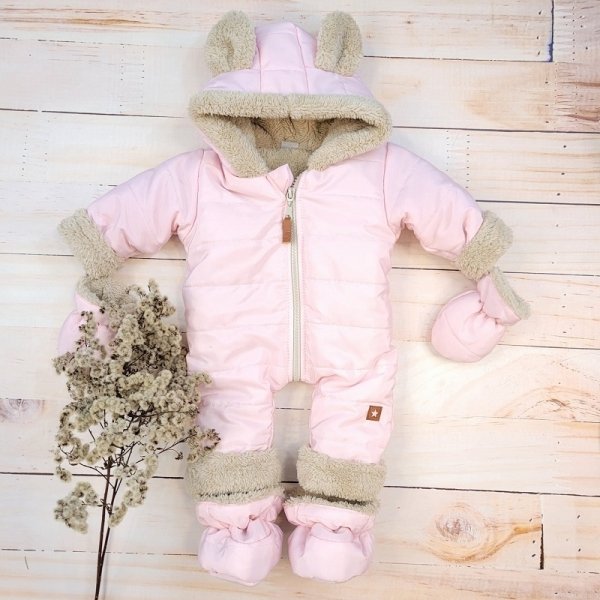 Zimní kombinéza s ozdobným béžovým medvídkem.